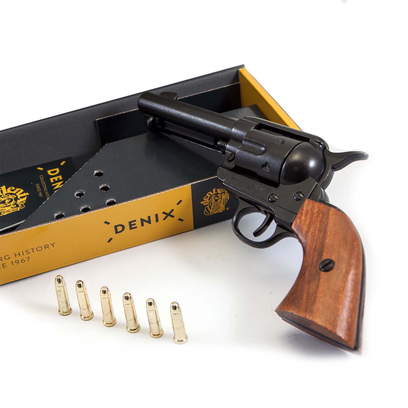 Modellen har varit med i de flesta krig från Amerikanska Indiankriget till både WWI och WWII. Modellen är som ni förstår en mycket populär samlarklassiker och denna replika är som originalet en singel action vilket innebär att du kan spänna upp hanen och sedan torravfyra, trumman går även att snurra runt samt patron-utpetaren fungerar också.