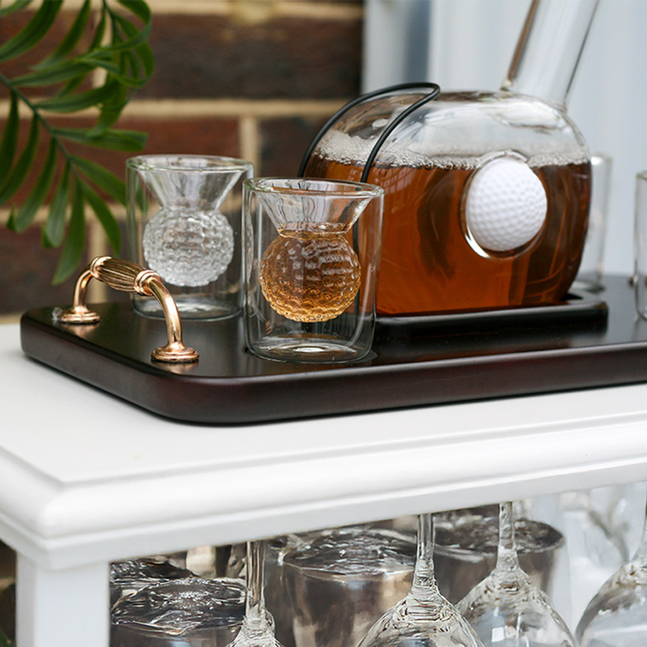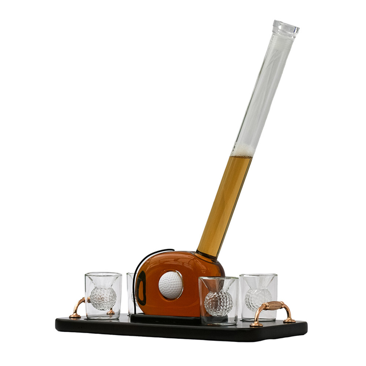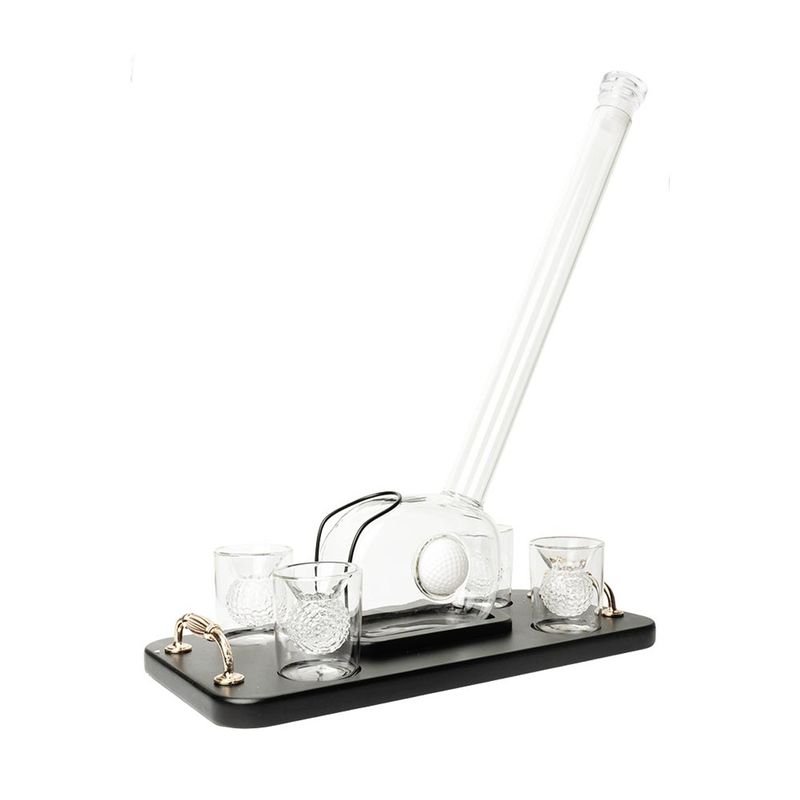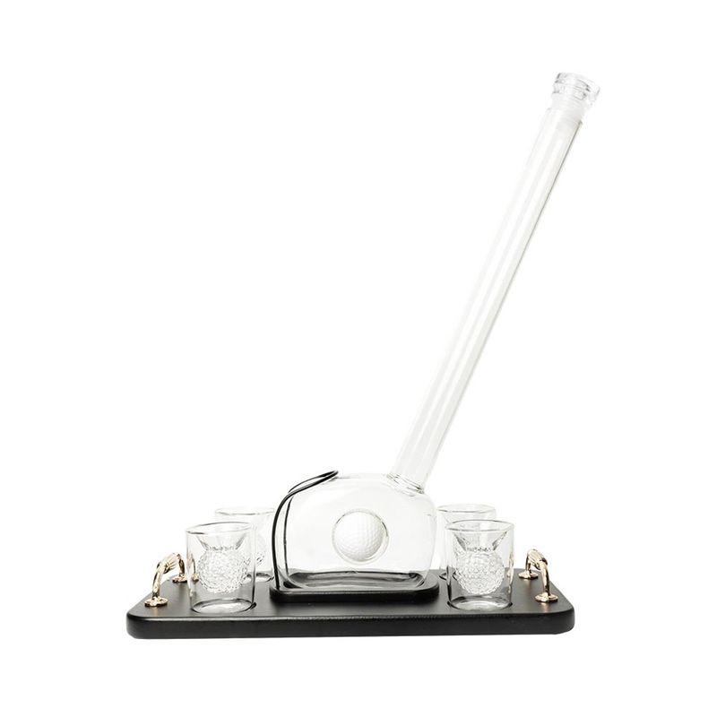 Servera drycken med stil ur denna imponerande karaff formad som en golfklubba som står på en snygg träbricka med fyra matchande glas med golfbollsdetaljer.