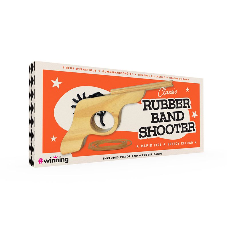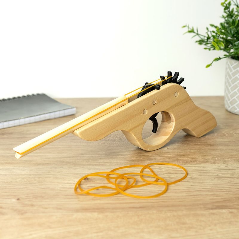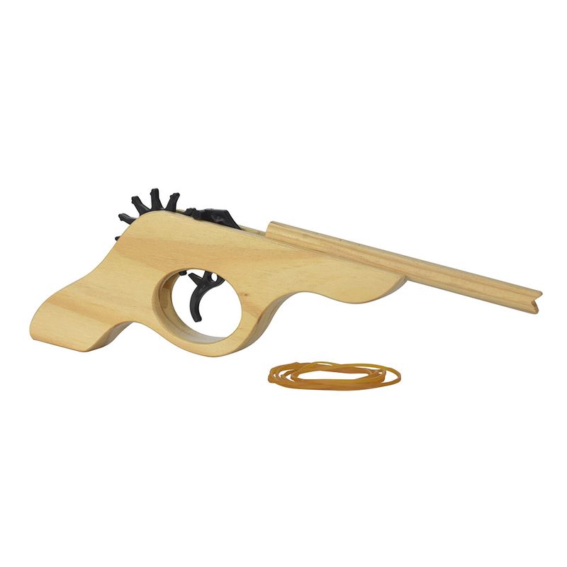 Med denna klassiska träpistol som skjuter iväg gummiband kan du ha mycket skoj utomhus med dina kompisar. Ställ upp lätta föremål och tävla i hur många ni kan träffa. Ladda upp flera gummiband samtidigt för snabba action eller skjut dem ett i taget. Lika kul för stora som för små!