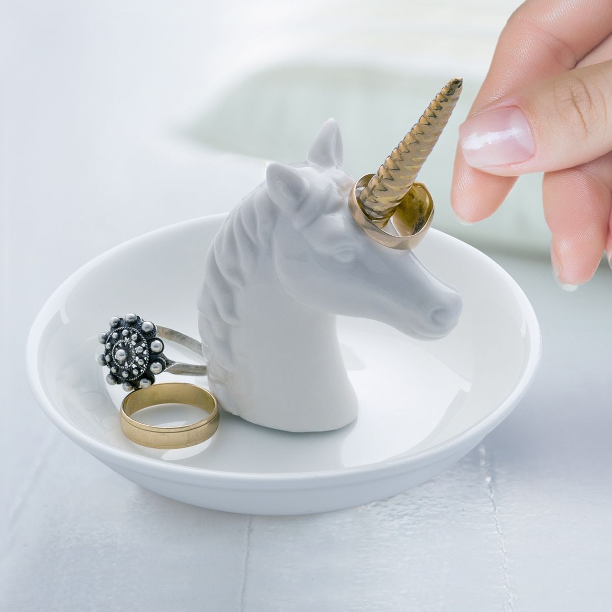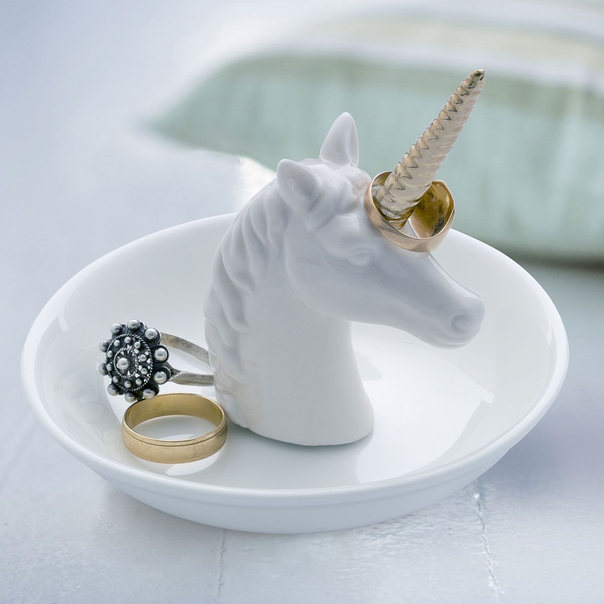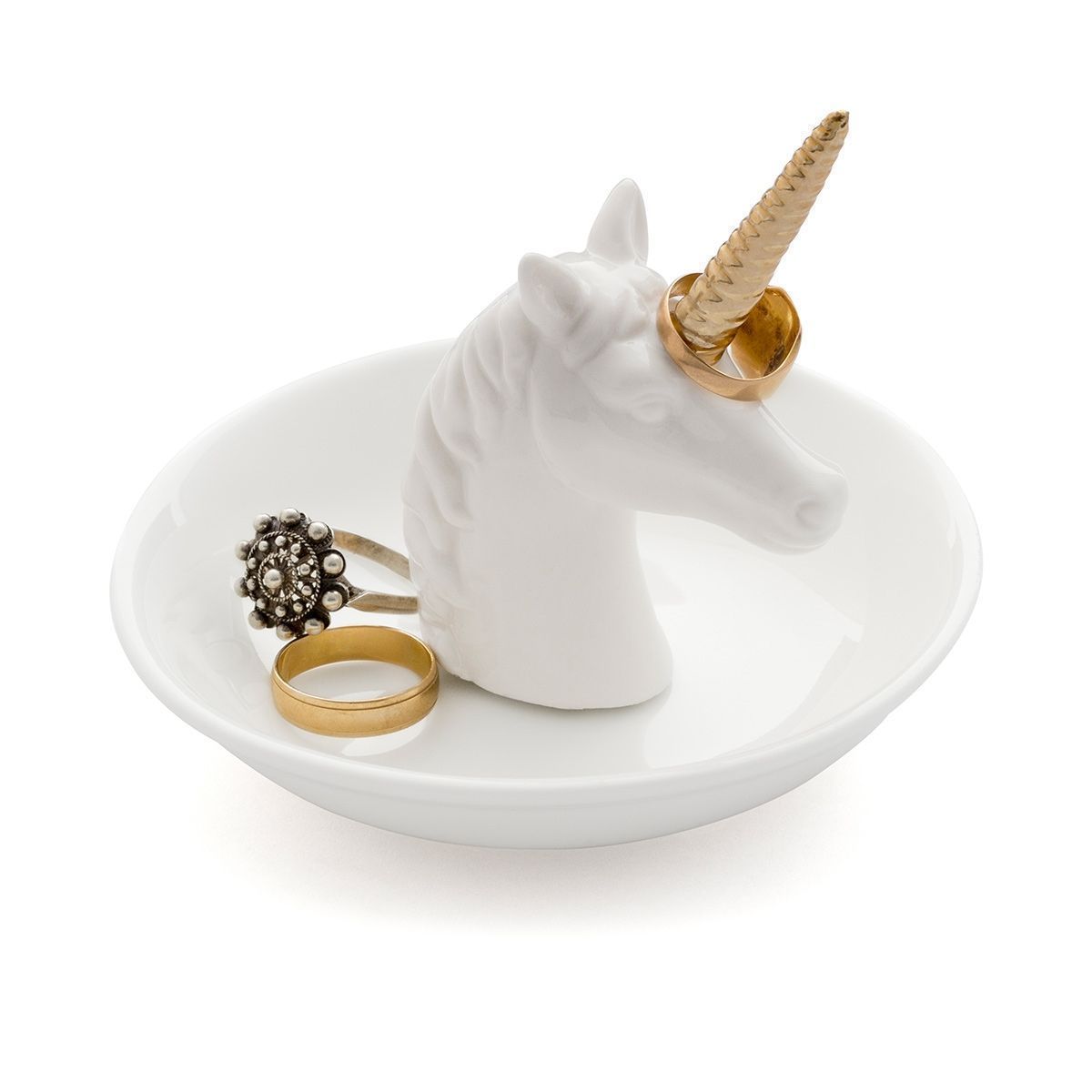 Enhörningshuvudet står på ett fat av keramik. Den har ett guldigt horn som fungerar som en liten hängare för t.ex. ringar.