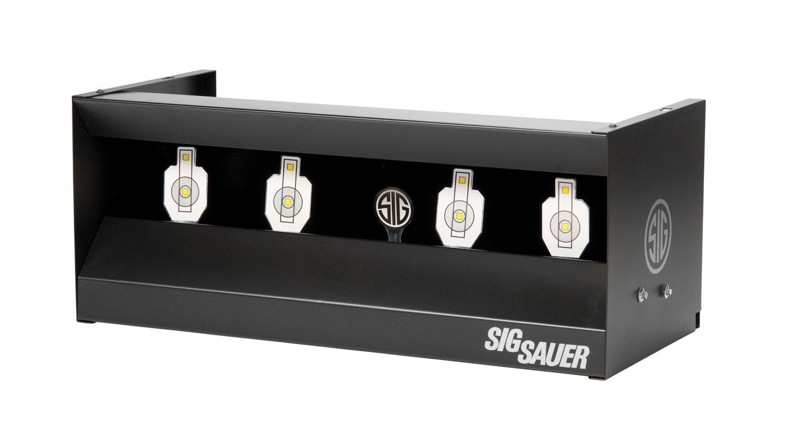 Sig Sauer har med lanseringen av sina nya luftvapen tagit fram passande ammunition samt tillbehör till dessa vapen. Här ett självmarkerande plåtmål med magnetlås. Det runda målet i mitten får övriga figurer att åka upp igen.