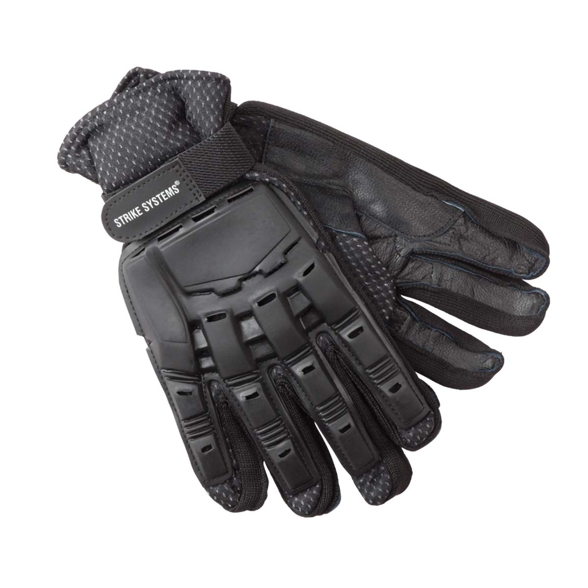 Skyddande svarta vantar i läder med förstärkningar i handflatan och på handryggen.
