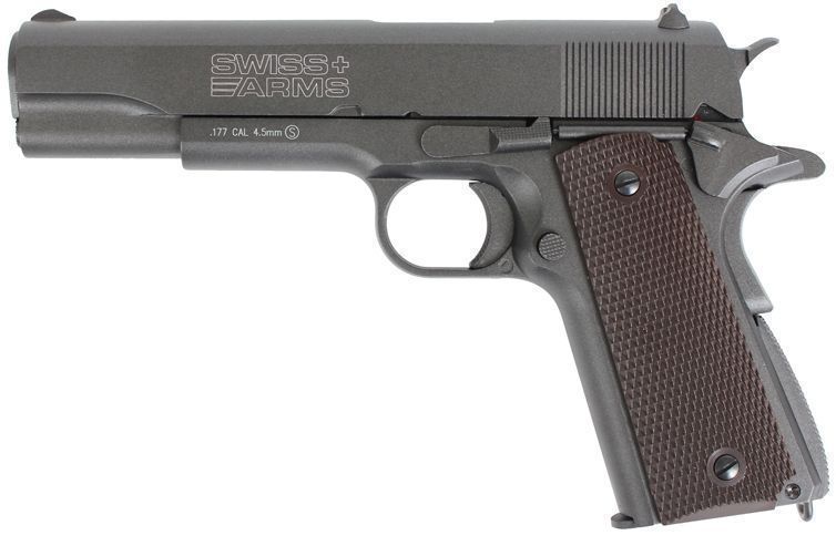 Gedigen semiautomatisk luftpistol med snabb semiautomatisk mekansim och blowback. Pistolen drivs av en 12g kolsyrepatron och magasinet rymmer 18stålrundkulor. Swiss Arms P1911 har precis som förlagan greppsäkring och är tillverkad nästan helt i metall.