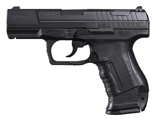 Walther P99. Fjäderdriven softairgun som finns i två modeller, en som är helt svart och en som är Bicolor, vilket betyder att den har silver slide och svart underdel. Extra magasin ingår. Magasinet rymmer 12st 6mm kulor. Utgångshastighet 70m/s.
