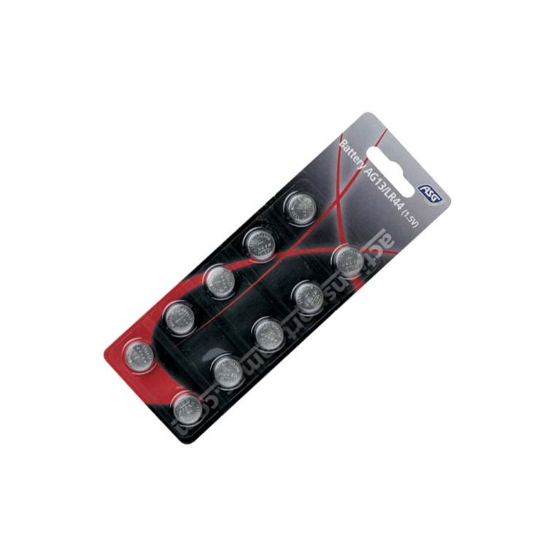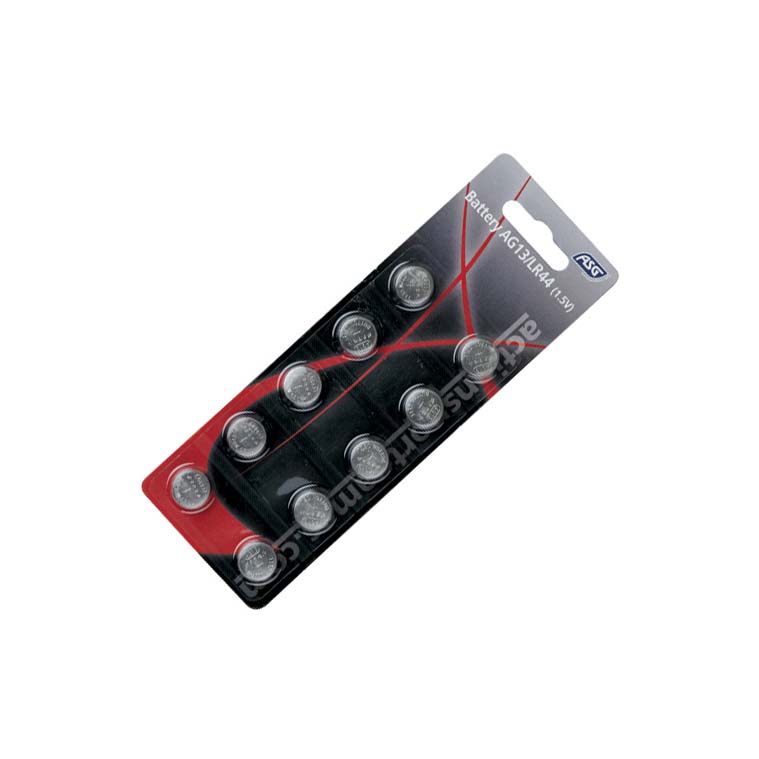 Förpackning med 10 st 1.5V AG13/LR44 knappcellsbatterier, som ofta används i lasersikten och andra elektroniska apparater. Diameter: 11mm Höjd: 5mm