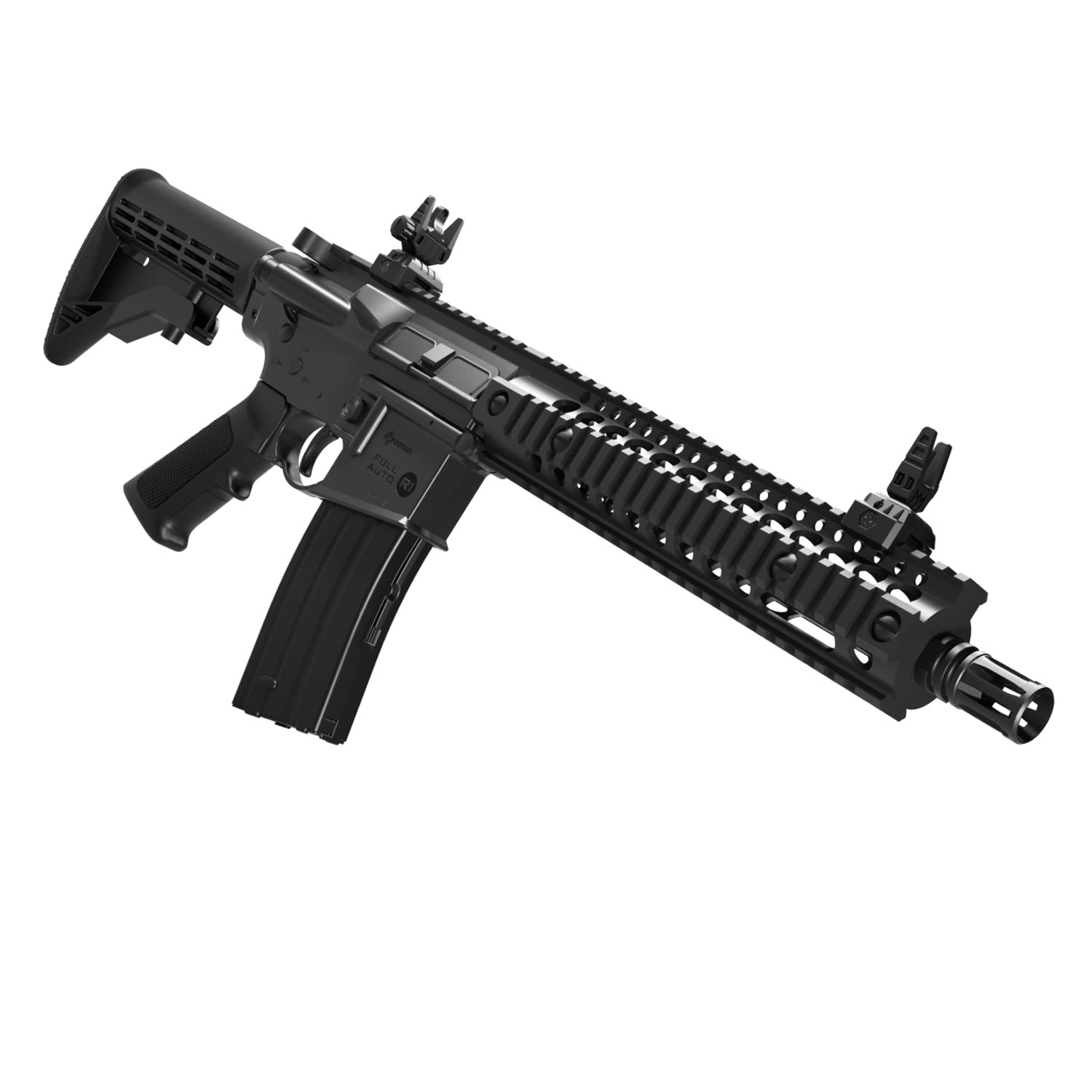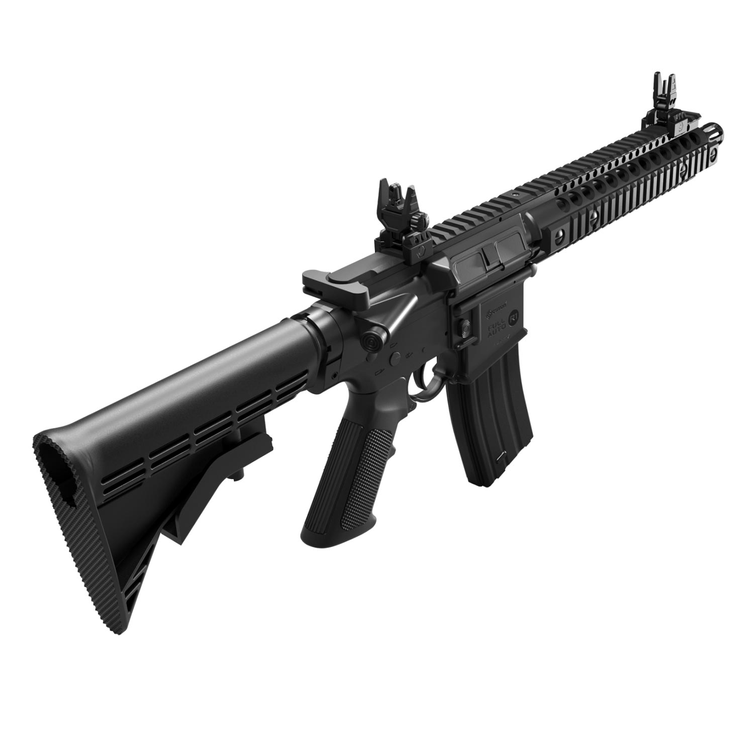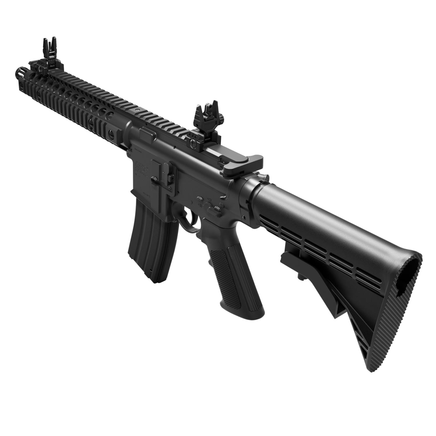 Geväret är en kopia av det klassiska Amerikanska AR geväret även känt som M4. Det finns rails att fästa tillbehör som laser, lampa, rödpunktsikte osv. Eller så använder du Flip Up siktet som sitter på geväret från fabrik.