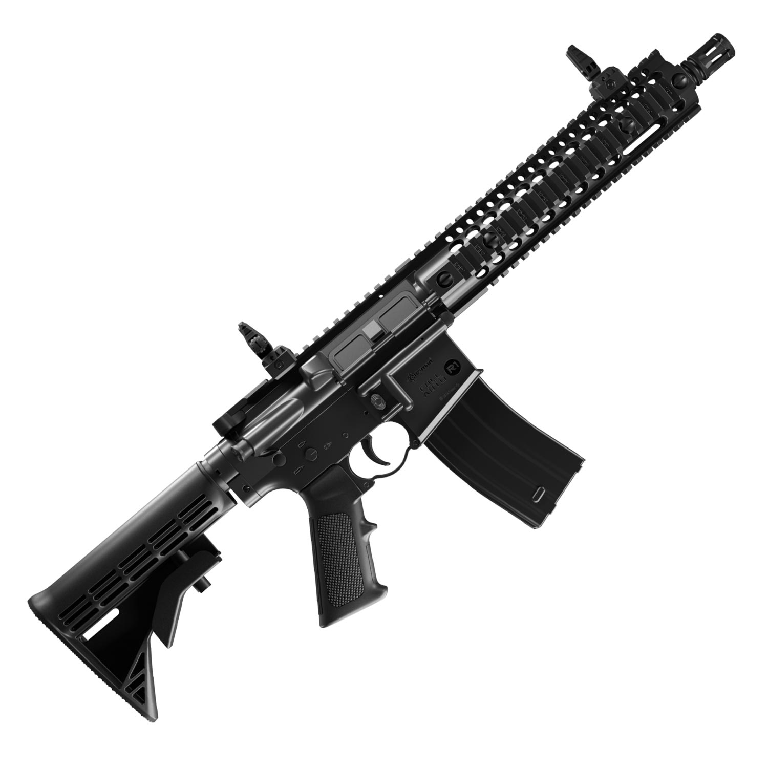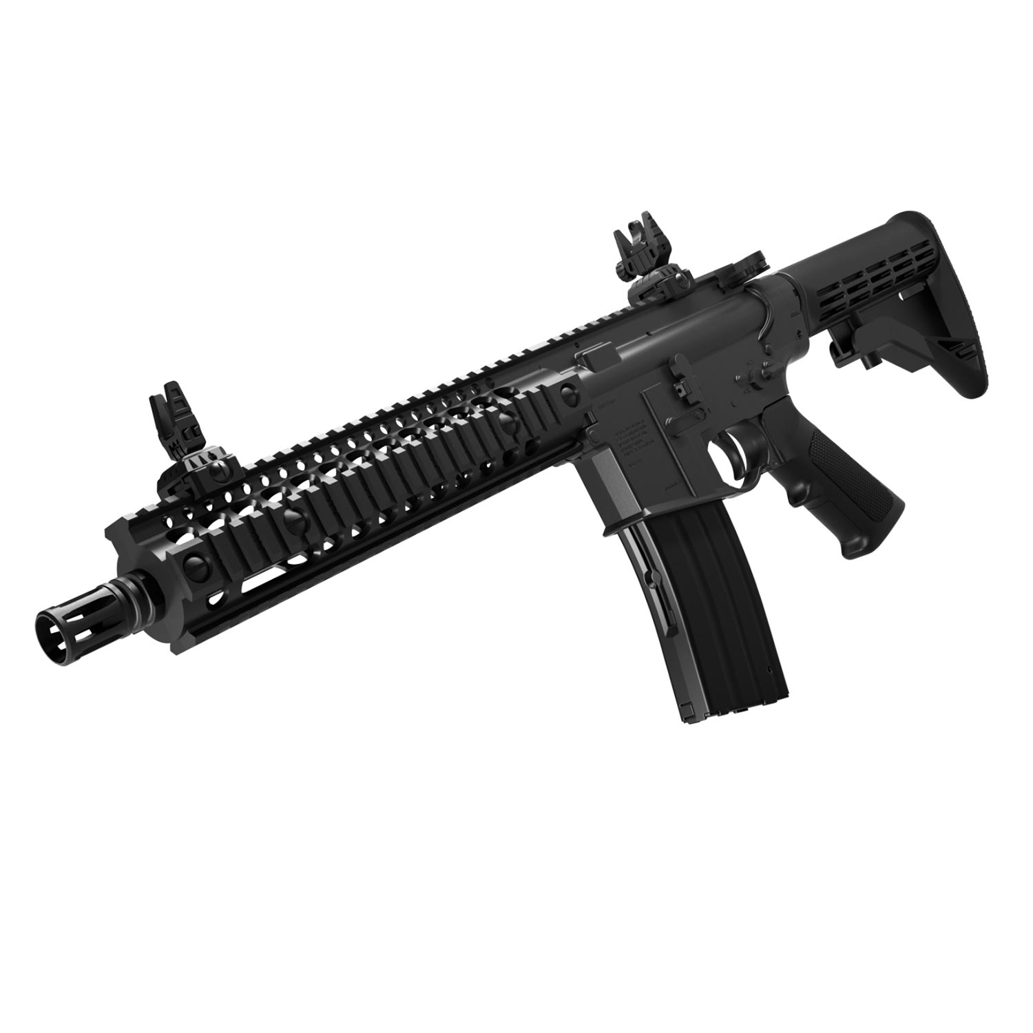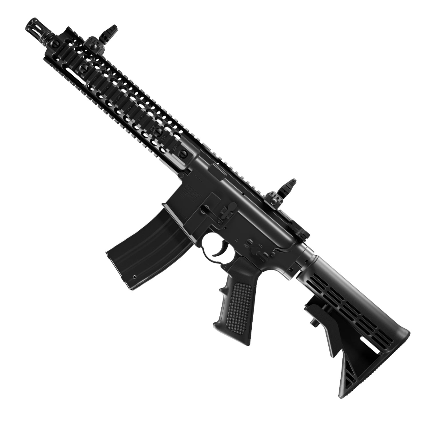 Geväret är en kopia av det klassiska Amerikanska AR geväret även känt som M4. Det finns rails att fästa tillbehör som laser, lampa, rödpunktsikte osv. Eller så använder du Flip Up siktet som sitter på geväret från fabrik.