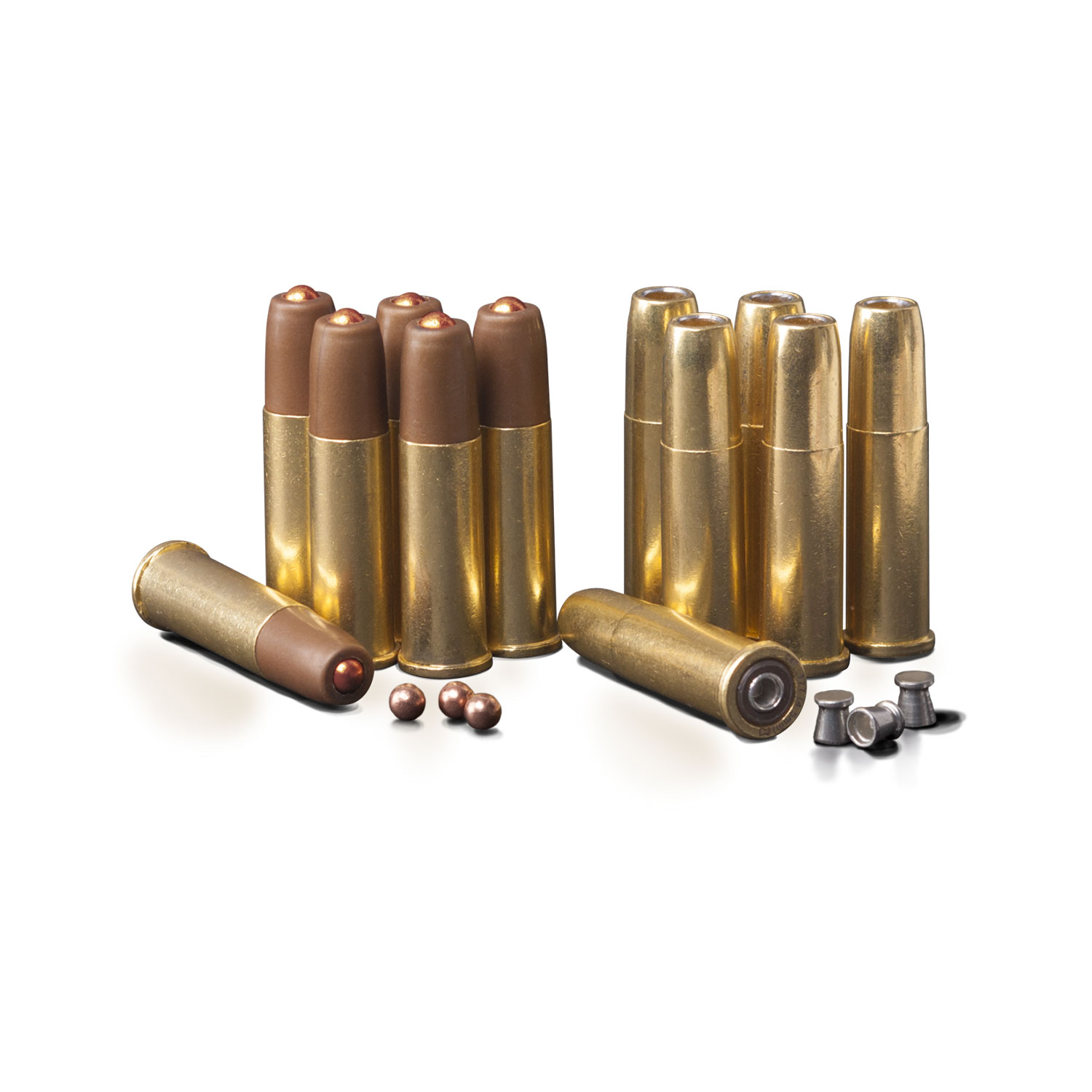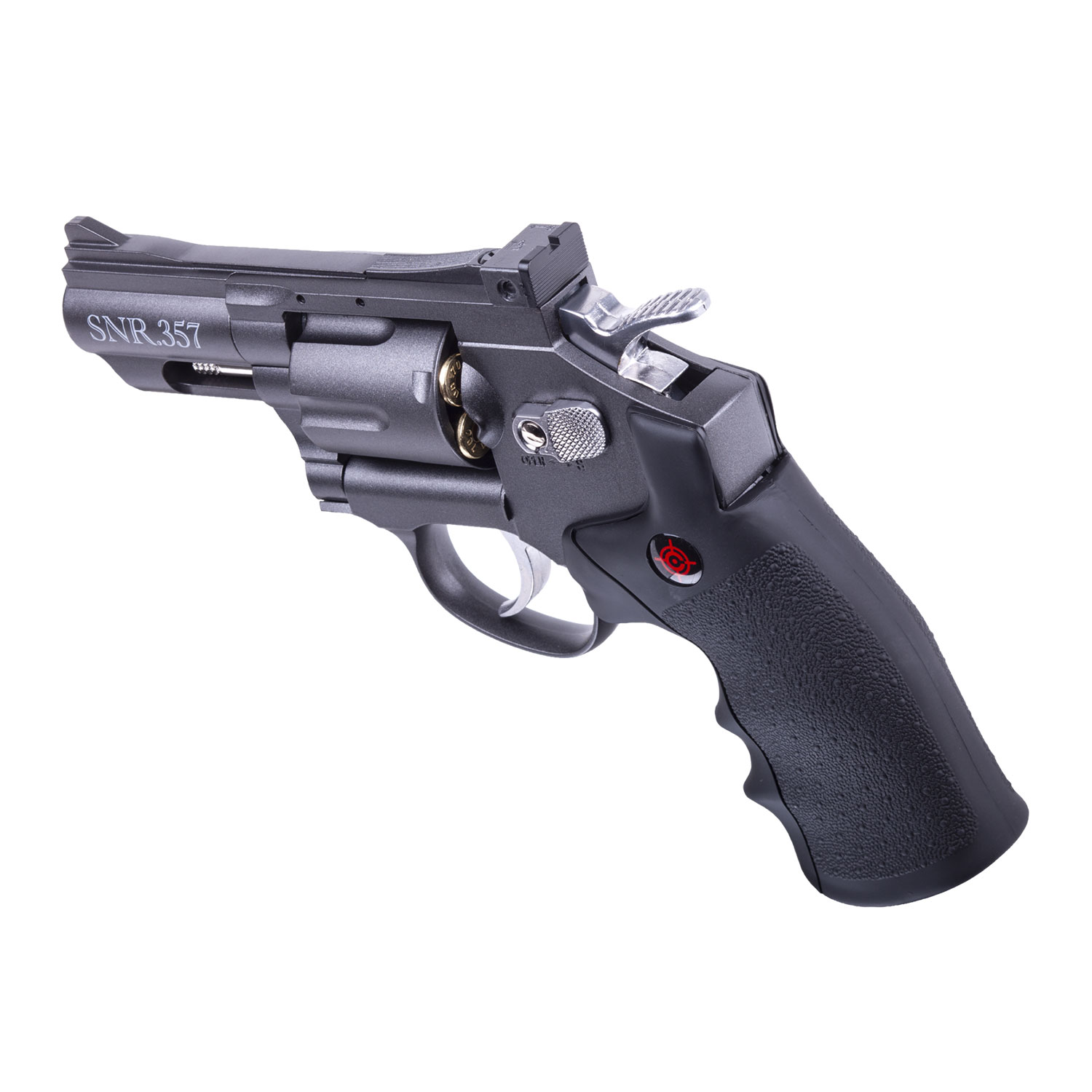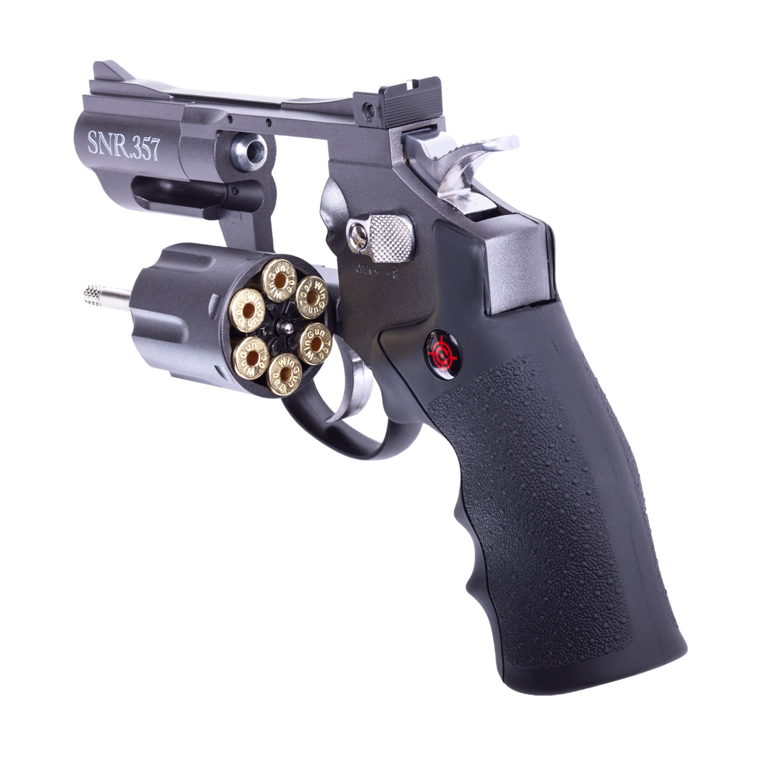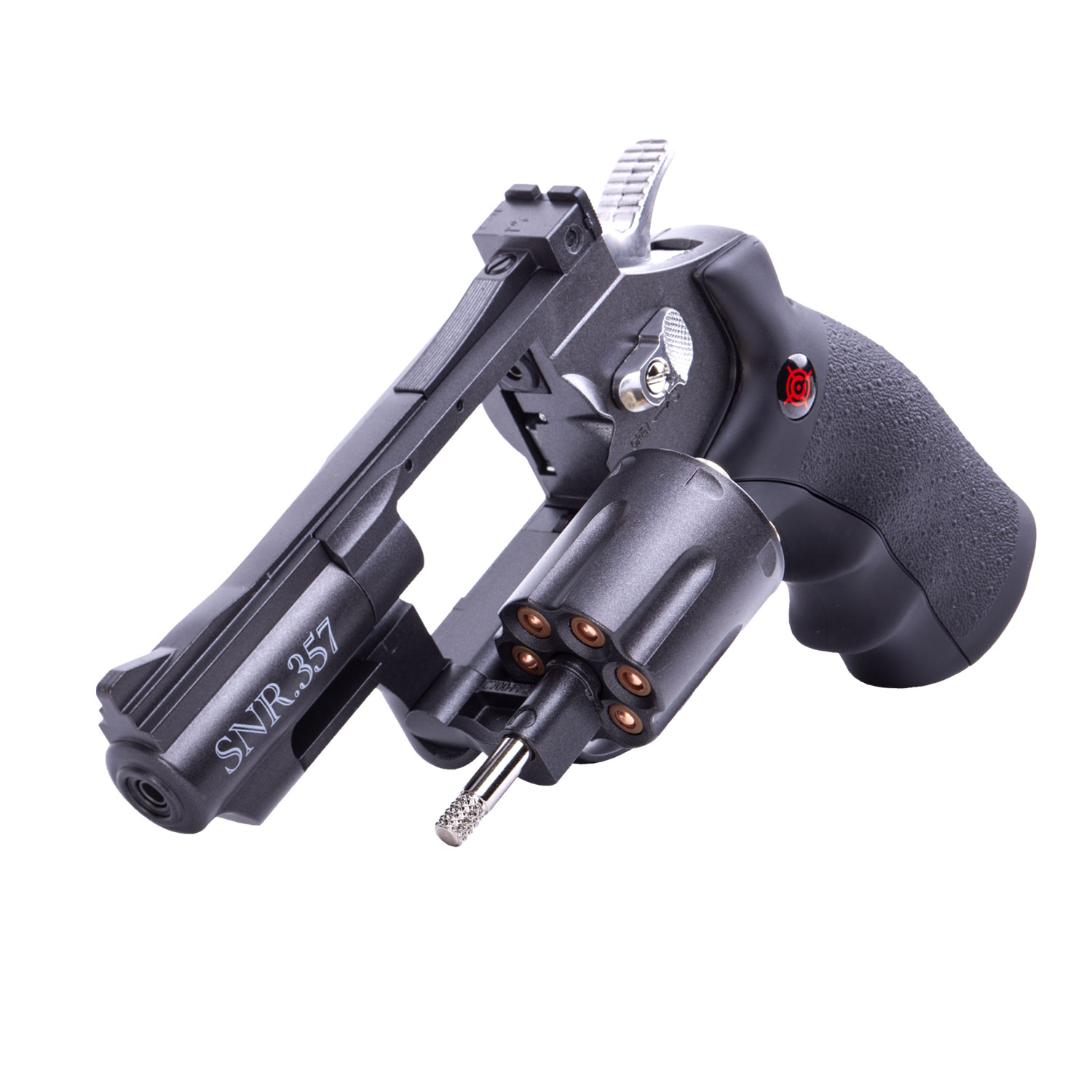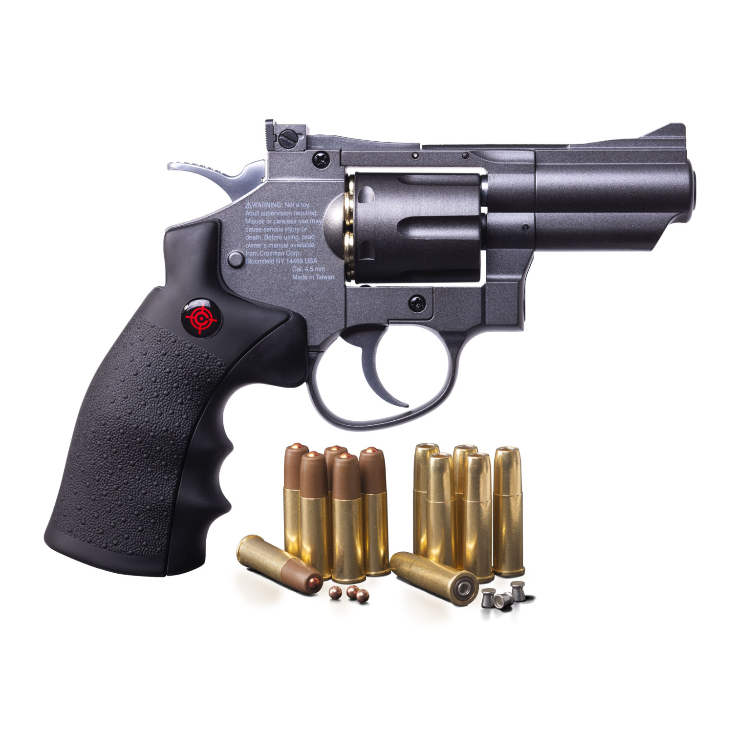 Revolver från Crosman som går att ladda med både stålrundkulor (bbs) samt diabolokulor. Drivs med 12g Co2-patron. Ammunitionen laddas i realistiska metallpatroner. Kropp tillverkad helt i metall.