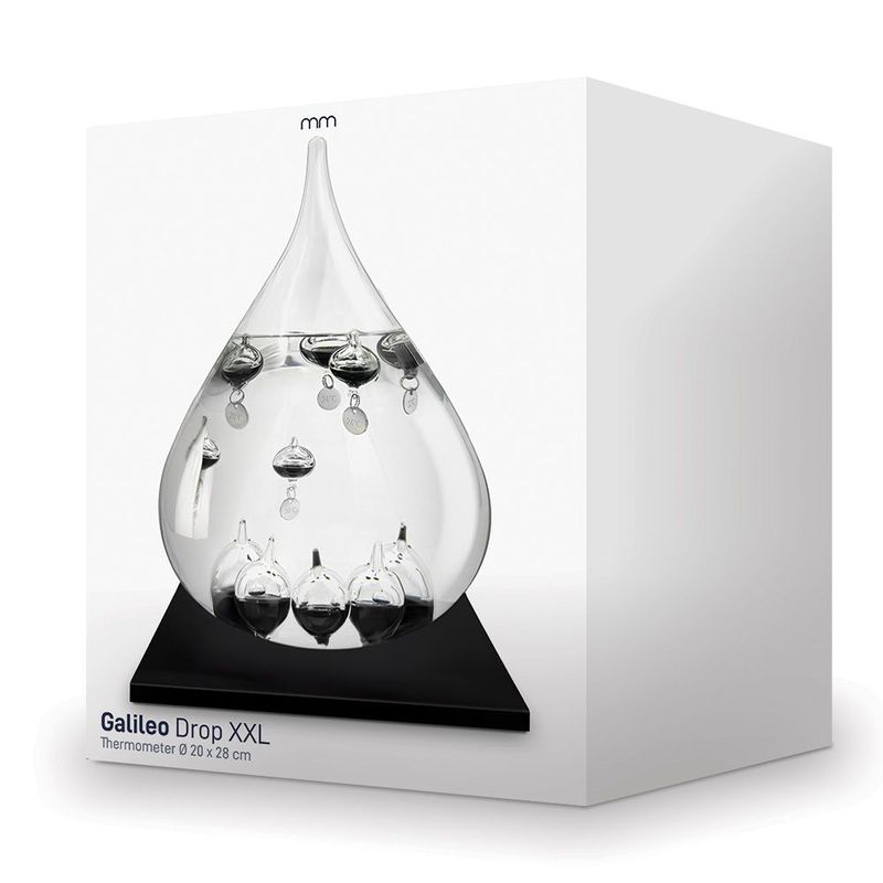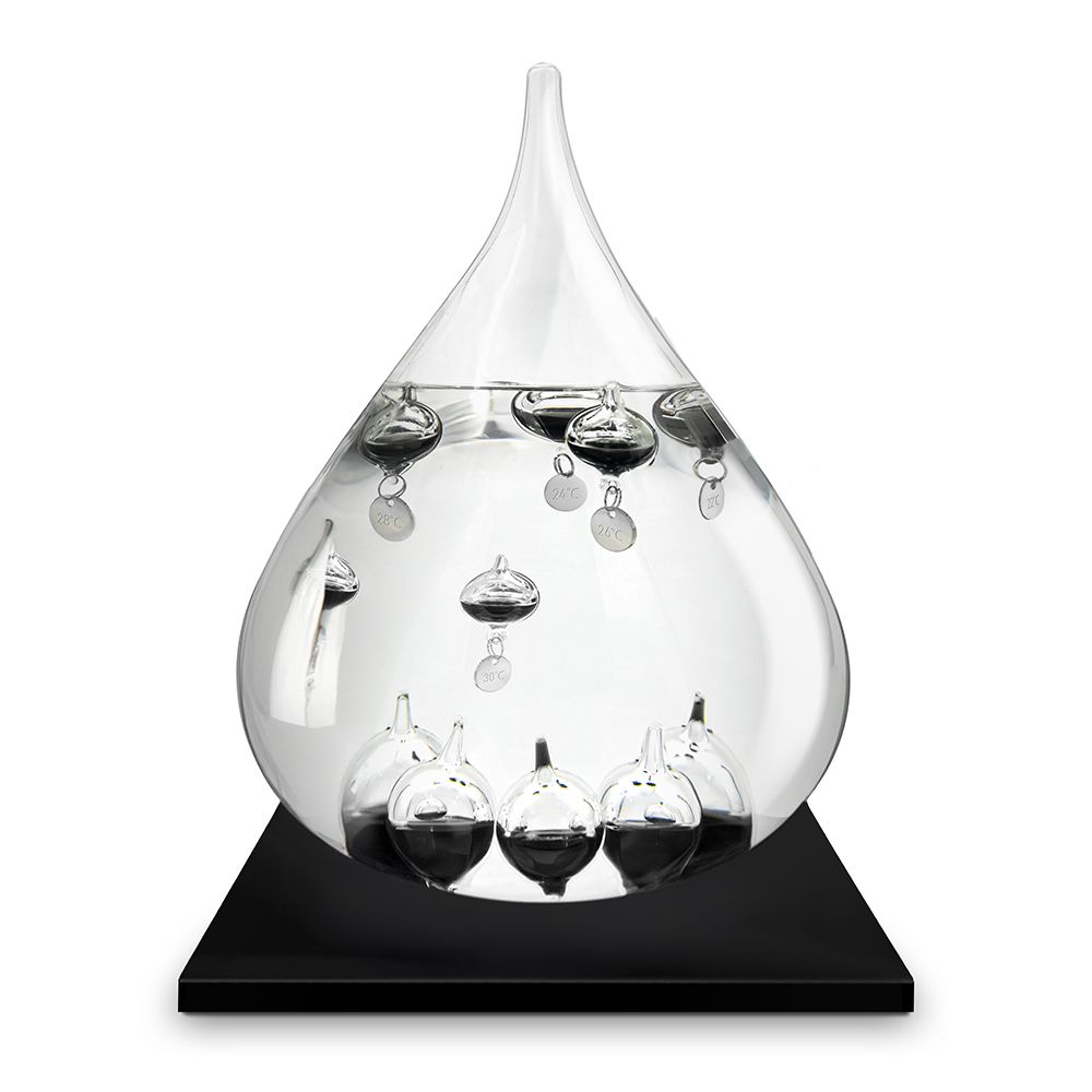 Denna droppformade Galileo-termometer är fylld med 9 sfärer som innehåller svart vätska, vilket indikerar temperaturer i Celsius. Presenterad på en svart träplatta för en elegant finish och ökad stabilitet.