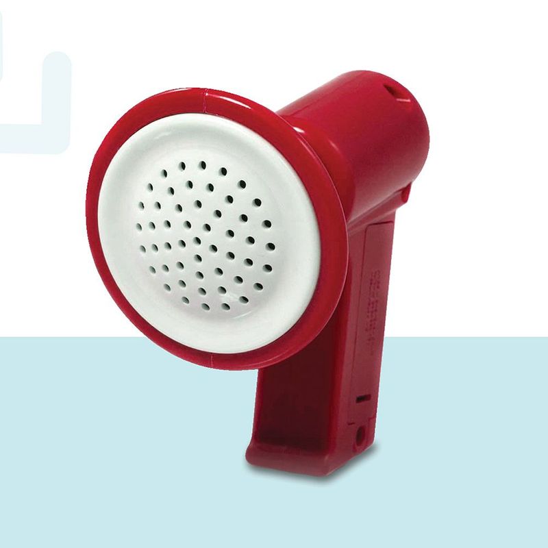 När du talar in i munstycket förvränger och förstärker minimegafonen din röst. Håll bara ned knappen för att skapa ett irriterande ljud.