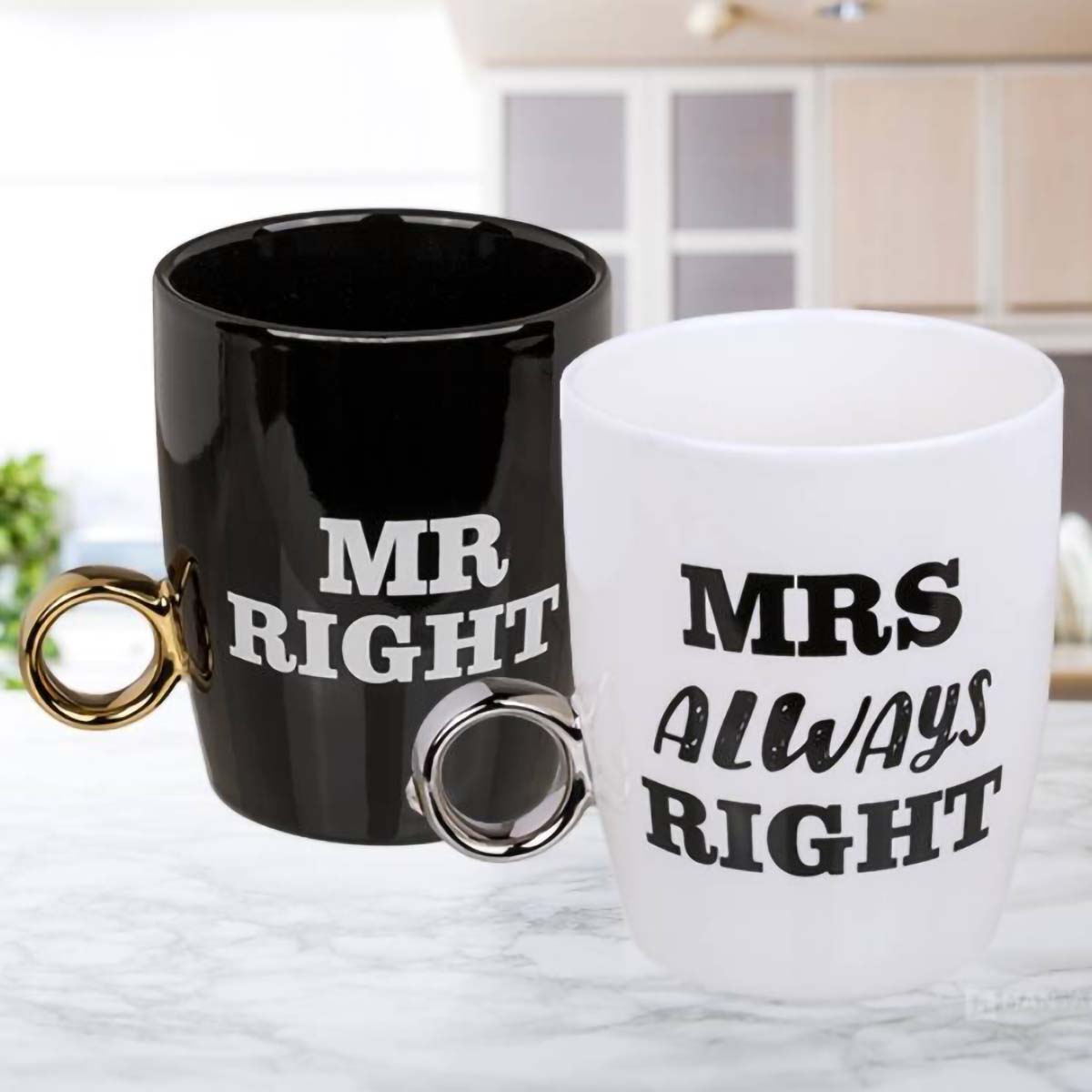 Vem är det egentligen som styr i hemmet? Riktigt roliga muggar till alla som vet vem som är den riktiga chefen hemma i huset. Ge bort den här roliga muggduon till din partner eller till ett par där ingen vill erkänna att de har fel. Den ena muggen har texten Mr. Right och den andra har Mrs. always right.