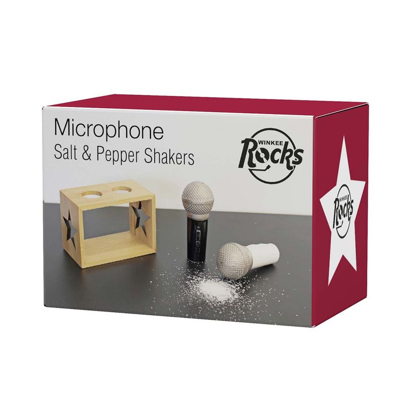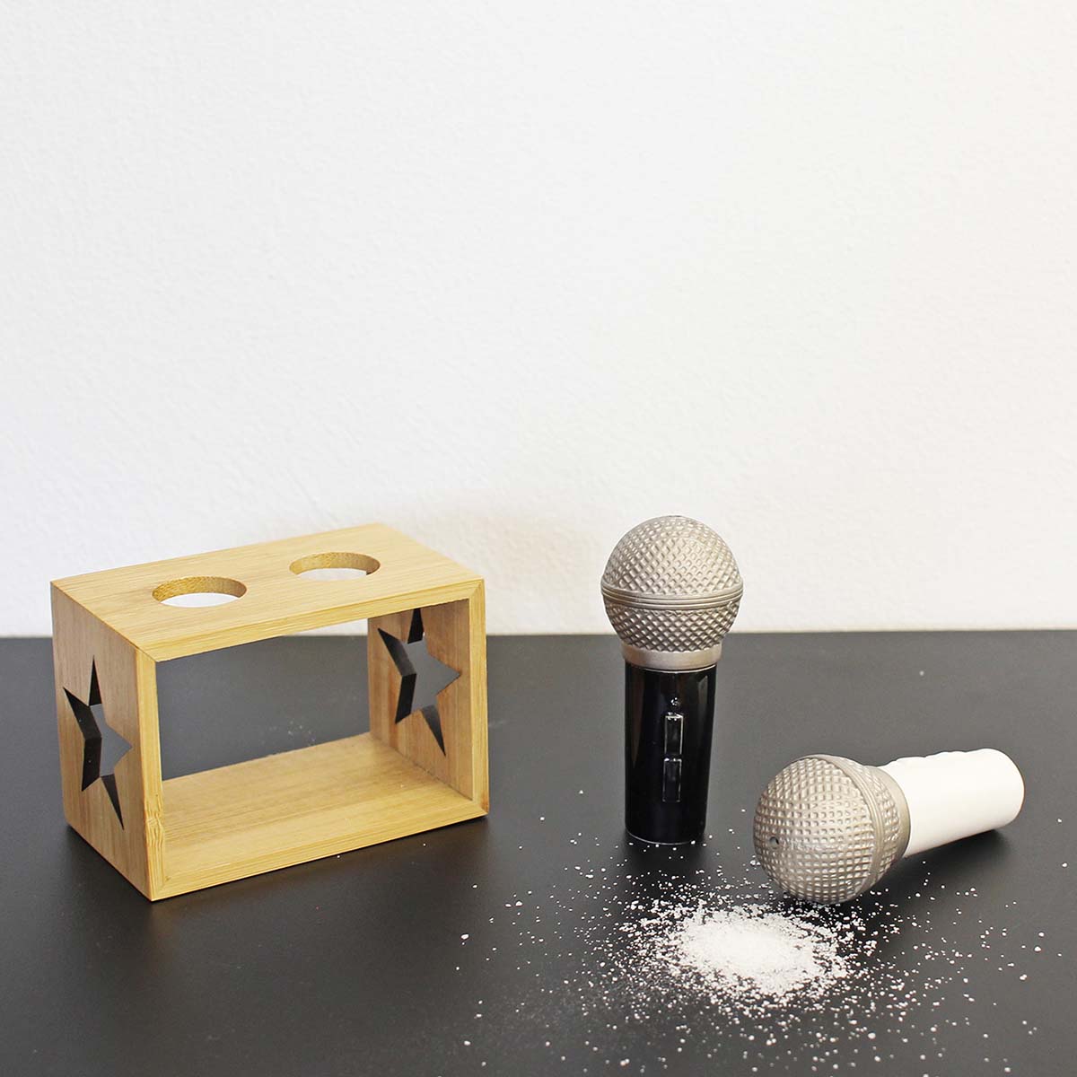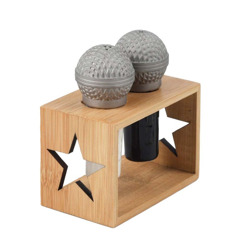 Salta och peppra maten med dessa cool mikrofoner. Riktigt fint salt-och pepparkar i form av mikrofoner som står i coolt träställ. Perfekt present till en riktig Singing Star!