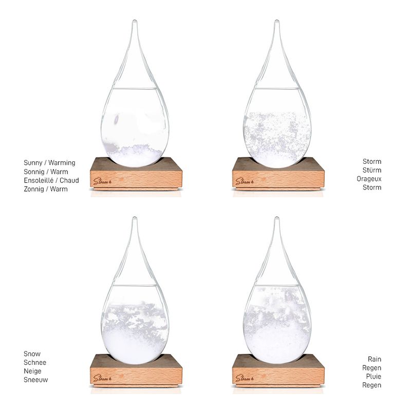 Stormglaset reagerar på atmosfäriska förändringar på ett mystiskt vis. Glaset är fyllt av en vätska och små kristaller som ändrar form efter vädret. Kristallerna kommer att ändra form beroende på det faktiska vädret som väntas komma inom någon eller några dagar. När kristallerna är synliga kan fuktigt och dimmigt väder förväntas. Ett molnigt glas med små kristaller kommer att berätta att åskväder är på väg och ett klart glas betyder klart väder.