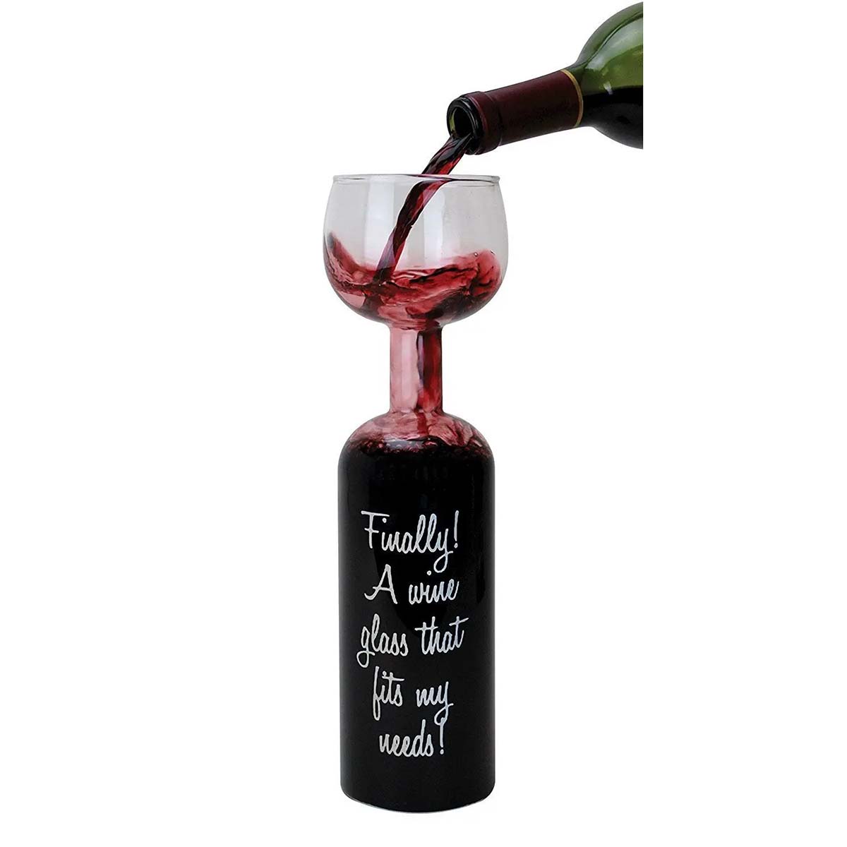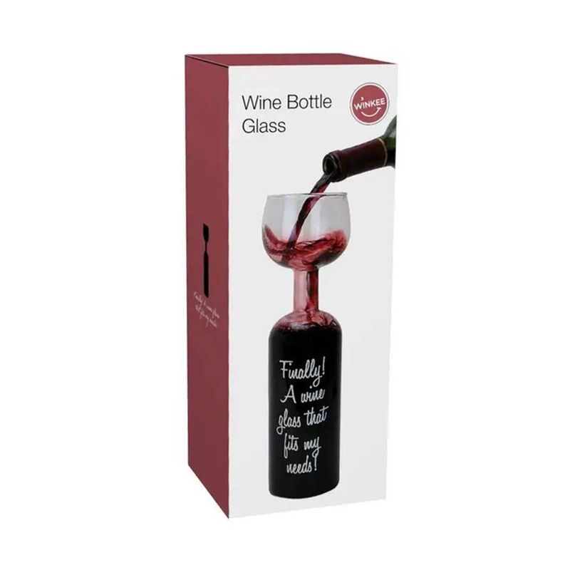 Vinglasflaska omfattas av en vinflaska med vinglasformad överdel samt texten "Finally! A wine glass that fits my needs!”. Glaset, eller ska vi säga flaskan, rymmer en hel vinflaska (75cl).