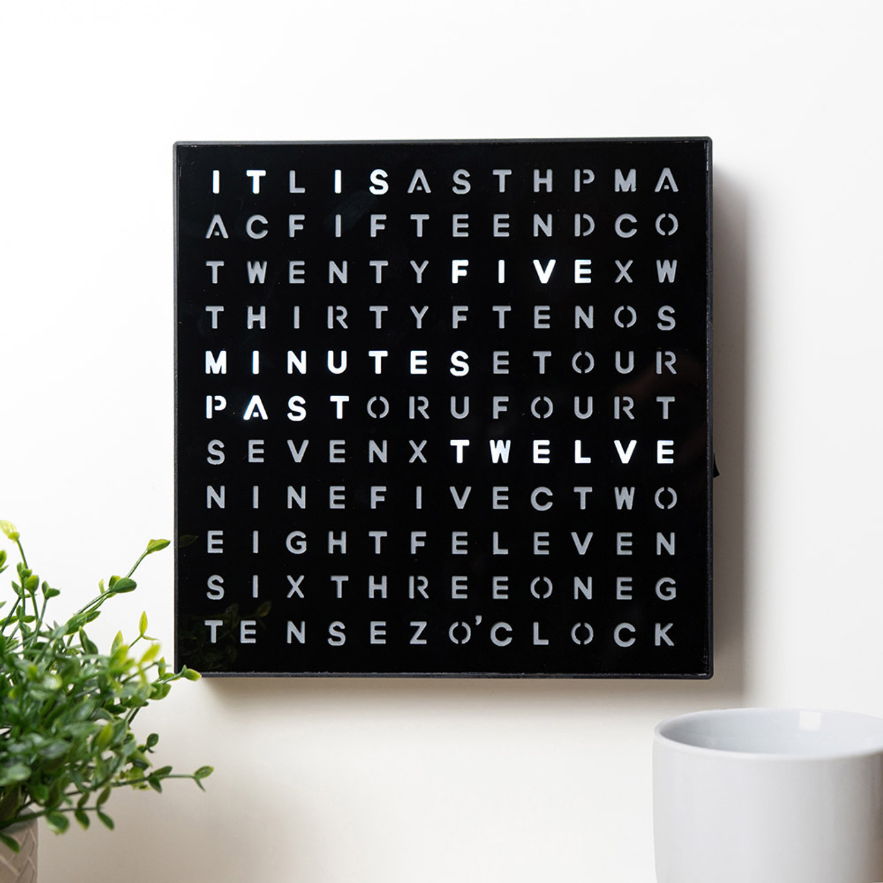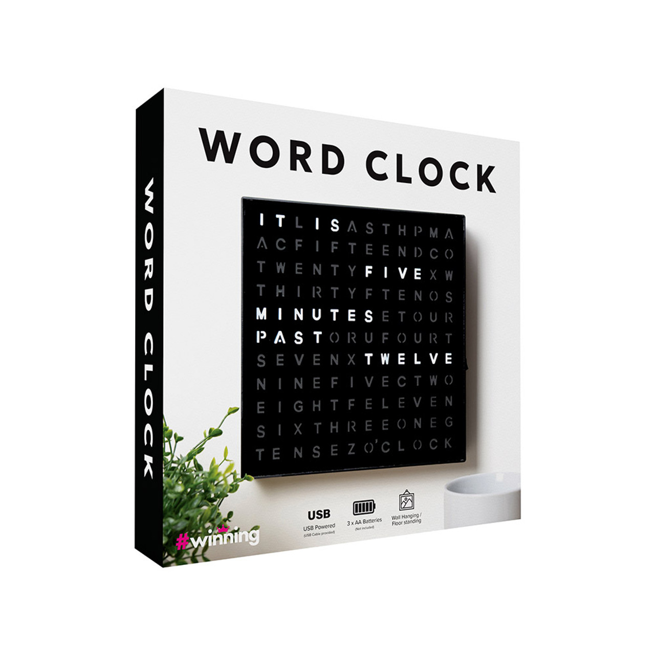 Klockans design består av en modern svart ram med 116 lysdioder bakom ett ordrutnät. Kan monteras på vägg eller stå fristående på ett skrivbord eller en hylla. Perfekt för den som är sifferblind och samtidigt vill öva på sin engelska klockkunskap.